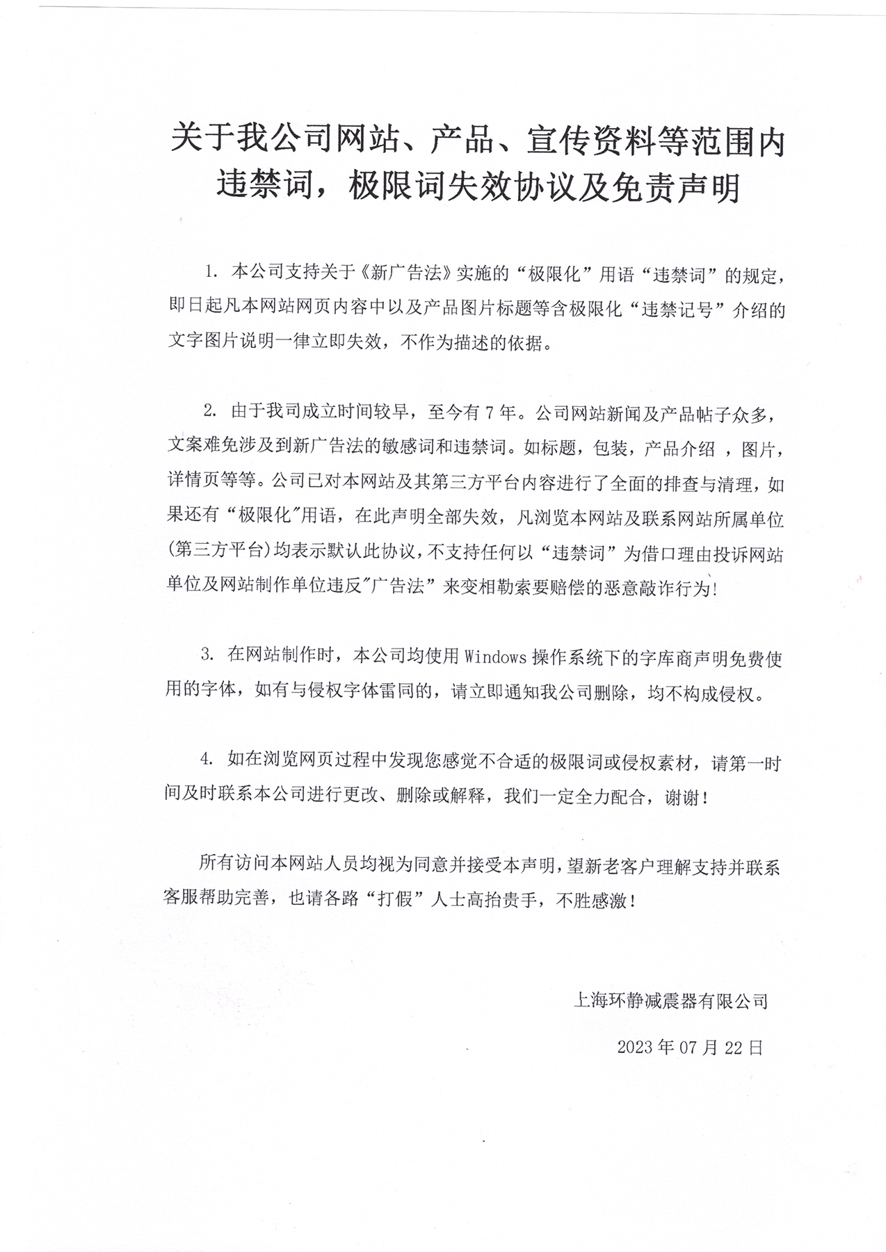 關于我公司網(wǎng)站、產(chǎn)品、宣傳資料等范圍內(nèi)違禁詞,極限詞失效協(xié)議及免責聲明